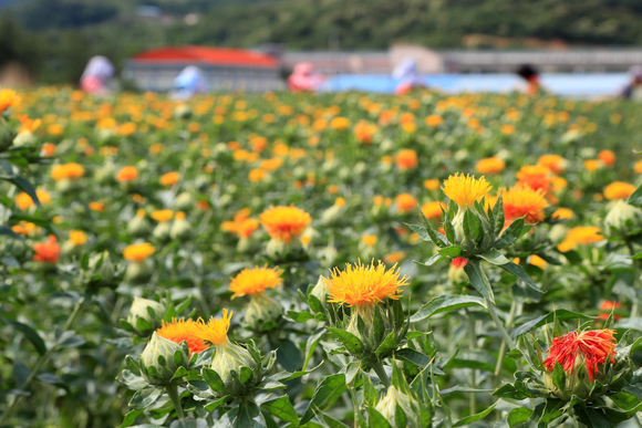 산청군의 대표약초인 홍화꽃은 6월 중순께 꽃잎이 노란색에서 빨간색으로 변하기 시작할 때가 수확 시기로 7월까지 수확이 이어진다.