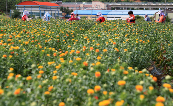 [쿠키뉴스 산청=이영호 기자] 경남 산청군 산청읍 일원에서 올해 홍화꽃 수확이 시작됐다.