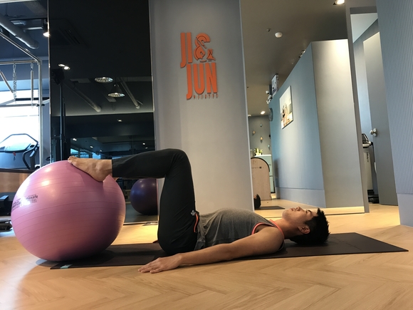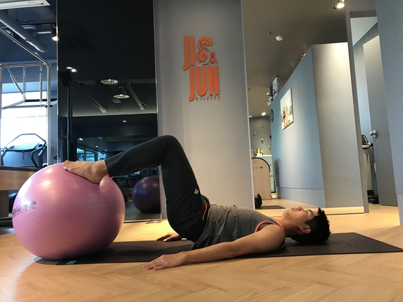 우선 가장 중요한 시작자세다. 발 아래에 짐볼을 위치시키고 골반의 위치는 편안하게 유지한다. 바닥과 허리 사이의 공간이 약간 떠있고, 골반의 뼈와 치골이 판판한 ‘뉴트럴’상태. 좌,우 균형이 맞게 일직선을 유지해 S자 곡선을 가진 척추의 가장 이상적인 모습을 유지한다. 또한 턱이 들리지 않도록 어깨와 가슴을 편다. 이때 허리가 지나치게 뜨지 않도록 코어를 단단하게 잡아 고정해주어야 한다. 또한 무릎의 위치는 골반선에 위치할 수 있도록 한다.