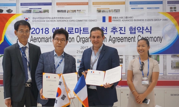 사천 항공부품 시장 개척을 위해 프랑스 파리에어쇼를 방문 중인 송도근 사천시장은 지난 21일 르부르제 전시장에서 프랑스의 세계적인 항공산업 관련 행사 주관사인 ABE 그룹의 스테판카스테트 회장이 참석한 가운데 ‘2018 에어로마트 사천’ 업무 협약을 체결했다.