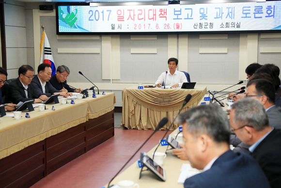 새정부 일자리 주요 공약사업 중 첫 순위인 공공부문 중심 일자리 창출을 위해 ▲군청 내 업무환경 개선을 위한 청원경찰 신설 ▲전문적이고 체계적인 웰니스 관광 운영을 위한 웰니스관광 전문가 양성·활동지원 ▲자활근로 참여 자격 확대 및 최저시급 보장으로 더 나은 행복자활근로사업 ▲음식물쓰레기 문전 수거방식 전환을 통한 클린산청 구현을 위한 일자리 등이 제시됐다.