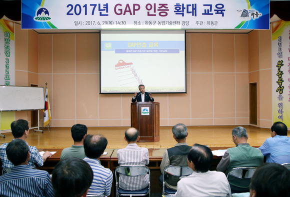 하동군이 소비자들이 선호하는 GAP(농산물우수관리제도) 농산물의 판매 촉진을 위해 29일 농업기술센터 강당에서 ‘2017 GAP 인증 확대 교육’을 했다.