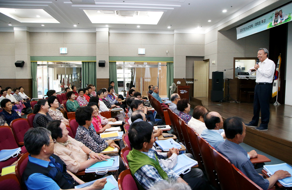 윤상기 군수의 특강은 ‘청춘(靑春)’이라는 주제로 100세 시대에 당당하게 늙는 5대 비결, 노인이 하지 말아야 할 10가지 등 멋있게 나이 드는 방법에 대한 내용으로 진행됐다.