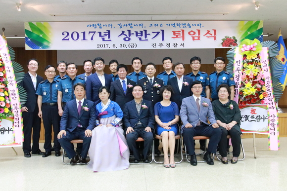 [쿠키뉴스 진주=이영호 기자] 경남 진주경찰서가 30일 경찰서 4층 강당에서 경찰관, 퇴임자 가족 등 50여명이 참석한 가운데 2017년도 상반기 정년퇴임식을 열었다.