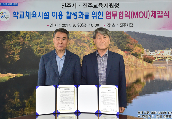 이창희 진주시장과 정명규 진주교육지원청 교육장은 30일 진주시청 기업인의 방에서 학교체육시설 이용 활성화를 위한 업무협약(MOU)을 체결했다.