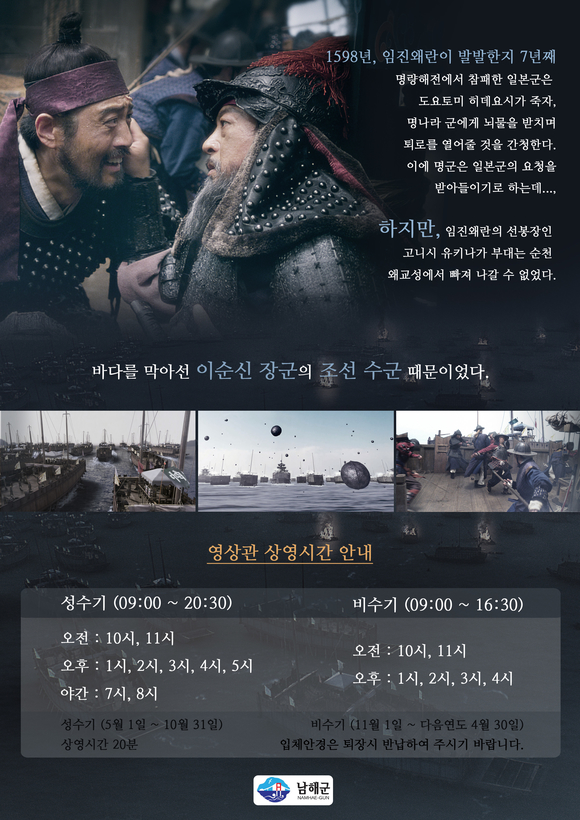남해군은 총 사업비 20억 원을 투입해 이순신 영상관 영상콘텐츠 개선공사 중 하나인 ‘노량, 불멸의 바다’ 영상 제작을 완료했다.