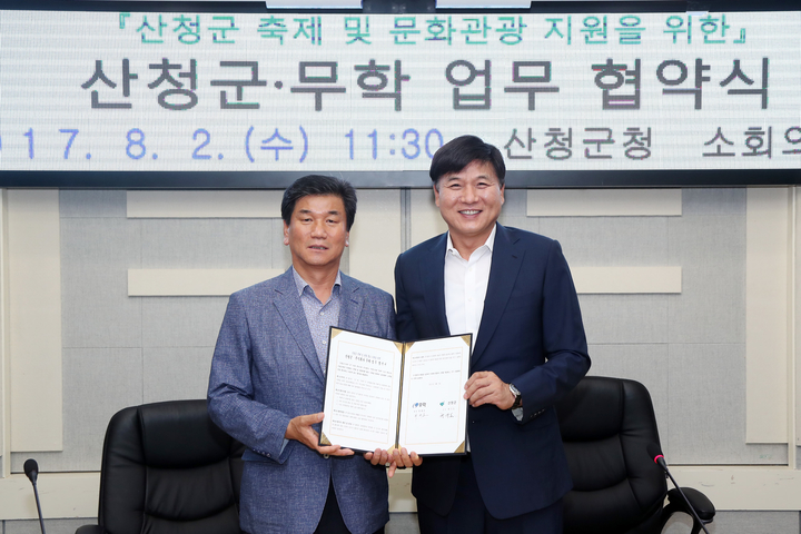 산청군은 2일 군청 소회의실에서 허기도 군수와 최재호 ㈜무학 회장 등 관계자들이 참석한 가운데 산청군 축제와 관광홍보 지원 업무협약을 체결했다.