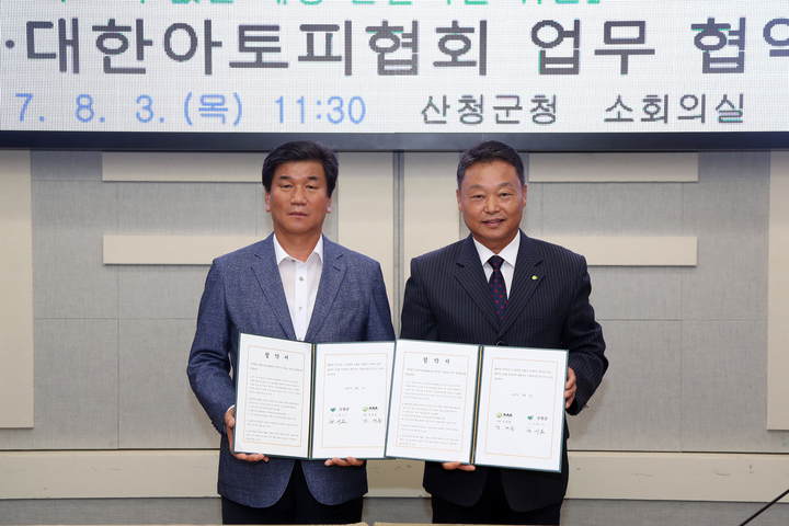 산청군은 지난 3일 군청 소회의실에서 허기도 군수와 장재훈 (사)대한아토피협회 회장 등이 참석한 가운데 업무협약을 체결했다.