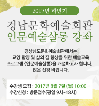 경남문화예술회관은 2017년 하반기 예술교육프로그램의 일환으로 ‘오페라 클래스’, ‘플루트 클래스’, ‘재즈강좌’에 이어 ‘인문예술살롱’을 추가 진행한다고 밝혔다.