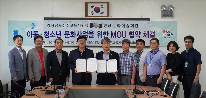 [쿠키뉴스 진주=이영호 기자] 경상남도문화예술회관과 경상남도진주교육지원청이 24일 진주교육지원청 중회의실에서 ‘학생들의 정서 함양 및 교양 수준 향상을 위한 문화교류’ 업무협약을 체결했다.