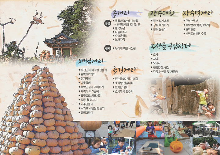 늙은 호박 높이쌓기 대회와 호박쿠키 만들기, 호박인절미 떡메치기, 호박 무게 맞추기, 호박 조각하기 등 ‘호박’을 주제로 한 체험프로그램도 열린다.