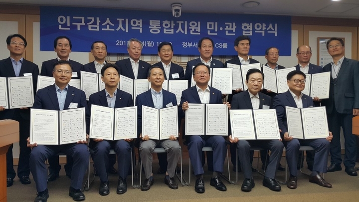 행안부 이날 인구감소 지역 지원을 위해 KT, LH 등 5개 민간기업과 공모사업에 선정된 지방자치단체장들이 참석한 가운데 협약식을 열었다.