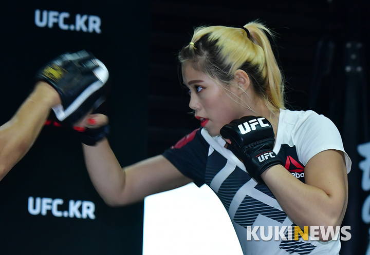 [쿠키뉴스=박태현 기자] UFC 선수 전찬미가 6일 오전 서울 보광로 이태원MMA에서 공개훈련을 하고 있다.