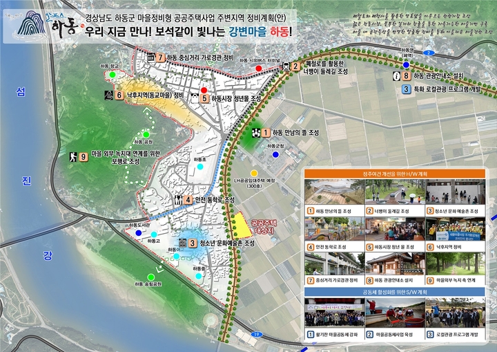 하동군은 광평리 원불교∼철도제방 일원에 주변 개선사업과 함께 40∼60㎡ 규모의 30년 영구임대주택 10세대, 사회 초년생·신혼부부 등에 임대하는 행복임대주택 20세대, 일반 군민에게 빌려주는 국민임대주택 70세대 등 100세대를 건립할 계획이다.