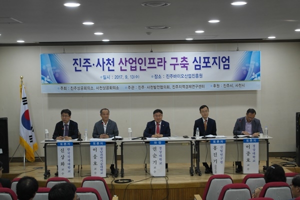 진주상공회의소(회장 하계백)와 사천상공회의소(회장 정기현)가 13일 진주바이오산업진흥원에서 진주‧사천시 관계자와 양 지역 유관기관(단체), 기업체 CEO 및 임직원, 시민 등 100여명이 참석한 가운데 ‘진주‧사천 산업인프라 구축 심포지엄’을 열었다.