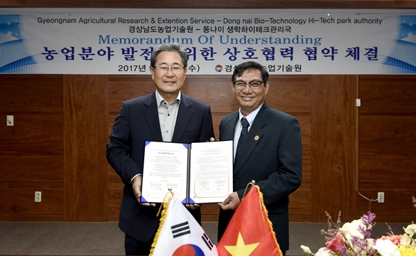 경상남도농업기술원이 베트남 동나이성과 시설원예작물 등 농업교류협력사업을 추진하기 위한 상호협력 협약을 27일 도농업기술원에서 체결했다.