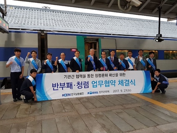 한국남동발전(주)과 코레일 진주관리역은 지난 27일 진주시 가좌동 진주역에서 청렴문화 확산을 위한 반부패·청렴 업무협약 체결식을 열었다.