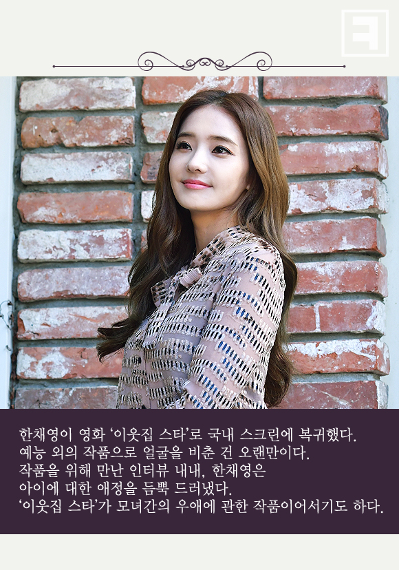 한채영이 영화 ‘이웃집 스타’로 국내 스크린에 복귀했다. 예능 외의 작품으로 얼굴을 비춘 건 오랜만이다. 작품을 위해 만난 인터뷰 내내, 한채영은 아이에 대한 애정을 듬뿍 드러냈다. ‘이웃집 스타’가 모녀간의 우애에 관한 작품이어서기도 하다.
