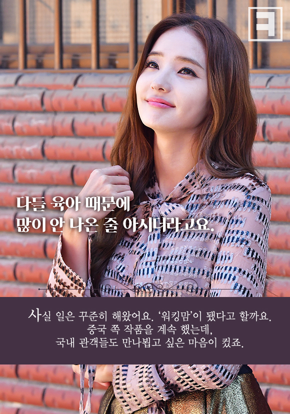 “다들 육아 때문에 많이 안 나온 줄 아시더라고요. 사실 일은 꾸준히 해왔어요. ‘워킹맘’이 됐다고 할까요. 중국 쪽 작품을 계속 했는데, 국내 관객들도 만나뵙고 싶은 마음이 컸죠.”