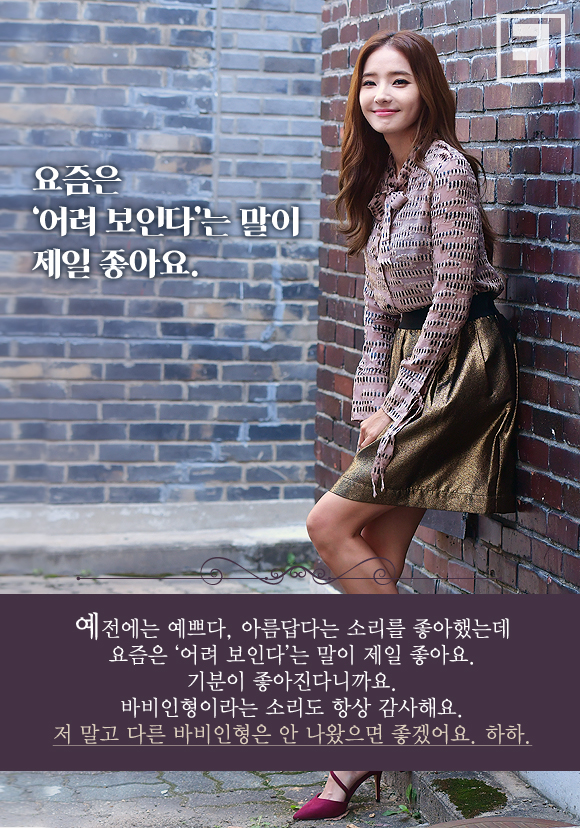 “예전에는 예쁘다, 아름답다는 소리를 좋아했는데 요즘은 ‘어려 보인다’는 말이 제일 좋아요. 기분이 좋아진다니까요. 바비인형이라는 소리도 항상 감사해요. 저 말고 다른 바비인형은 안 나왔으면 좋겠어요. 하하.”