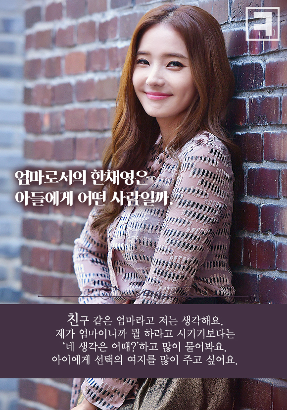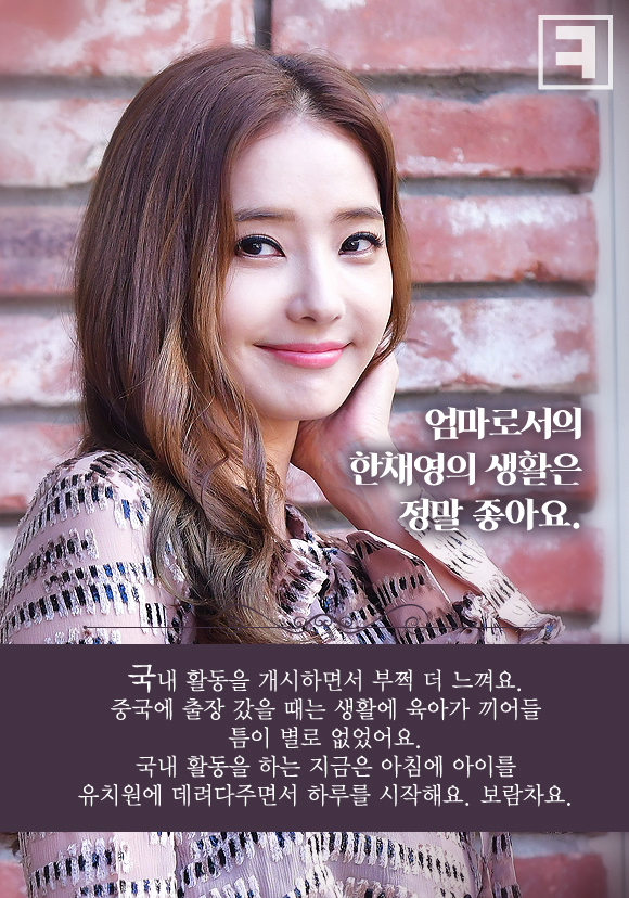“엄마로서의 한채영의 생활은 정말 좋아요. 국내 활동을 개시하면서 부쩍 더 느껴요. 중국에 출장 갔을 때는 생활에 육아가 끼어들 틈이 별로 없었어요. 국내 활동을 하는 지금은 아침에 아이를 유치원에 데려다주면서 하루를 시작해요. 보람차요.”