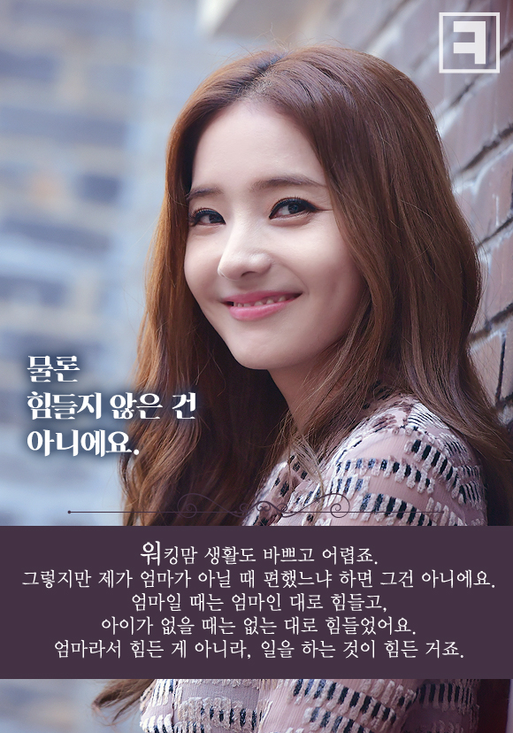 “물론 힘들지 않은 건 아니에요. 워킹맘 생활도 바쁘고 어렵죠. 그렇지만 제가 엄마가 아닐 때 편했느냐 하면 그건 아니에요. 엄마일 때는 엄마인 대로 힘들고, 아이가 없을 때는 없는 대로 힘들었어요. 엄마라서 힘든 게 아니라, 일을 하는 것이 힘든 거죠.”