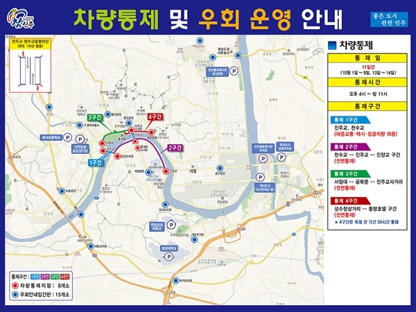 경남 진주시가 진주남강유등축제 등 10월 축제가 열리는 기간 동안 축제가 열리는 진주성과 남강 주변 도로의 교통을 통제한다.