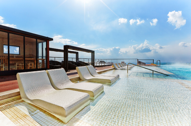 제주의 푸른 바다와 360도 파노라마로 펼쳐진 제주의 자연 경관을 한 눈에 담을 수 있는 최고의 전망과 시설을 갖춘 켄싱턴 제주 호텔의 루프탑 ‘스카이피니티’ 풀