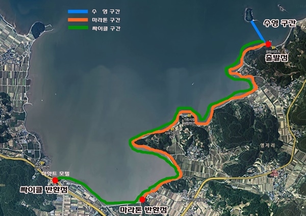 대회코스는 삼동면 고암마을 선착장에서 이동면 석평마을까지 이르는 해안도로 전 구간으로, 수영과 사이클, 마라톤 등 세 종목의 경기가 진행된다.
