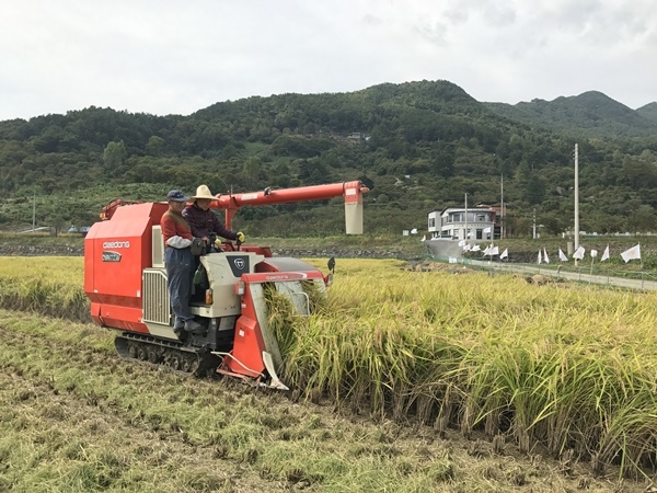 군은 이날 수확된 쌀은 40㎏들이 한 가마당 수매가격보다 1만 원 비싼 가격에 전량 사회적기업 ‘에코맘의 산골이유식’과 납품 계약했다.