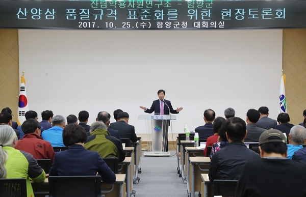 함양군은 지난 25일 군청 대회의실에서 임창호 군수, 이창재 국립산림과학원장, 산림청·산림약용자원연구소·한국임업진흥원 관계자, 학계 전문가, 산양삼 재배농가 등 100여명이 참석한 가운데 ‘산양삼 품질규격 표준화를 위한 현장토론회’를 열었다.