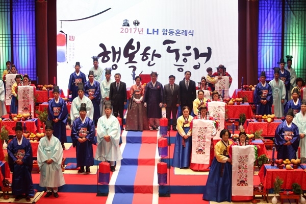 한국토지주택공사(LH)가 26일 경남 진주 본사 대강당에서 합동결혼식 ‘행복한 동행’을 열었다.