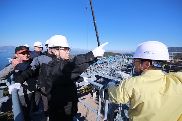경남 사천시의 핵심사업인 ‘사천바다 케이블카’가 내년 3월 상업운행을 목표로 공사가 순조롭게 진행되고 있다.