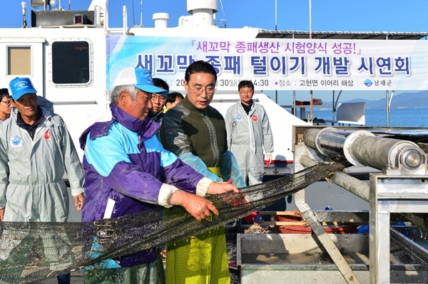 또 이날 시연회에는 채묘시설에 붙어있는 새꼬막 종패를 자동으로 분리해 내는 새꼬막 자동 털이기가 국내 최초로 선을 보였다.