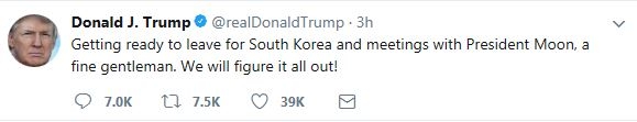 도널드 트럼프 미국 대통령이 방한을 앞두고 “‘훌륭한 신사’인 문재인 대통령을 만나기 위해 한국으로 떠날 준비 중”이라는 메시지를 SNS에 게재했다.
