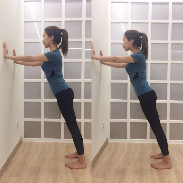 맨 벽에서 1m정도 간격을 두고 서서 어깨너비로 팔을 벌려 벽에 맞대어 놓은 뒤, 손바닥은 벽을 밀어 뒷목에 힘이 들어감을 느낀다. 그 다음 손바닥을 미는 힘은 유지한 채 목과 얼굴을 벽 쪽으로 강하게 밀어준다. 이 때 키는 위로 늘려주는 느낌으로 20번정도 반복한다.