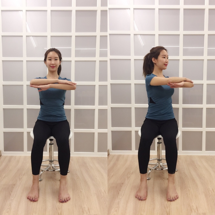 둘째, 척추 측만 증상을 보인다면 먼저 아래 사진처럼 의자에 앉은 상태에서 어깨에 힘이 들어가지 않게 팔꿈치를 접어 시작자세를 만들어 준다. 이 때 골반은 돌아가지 않게 고정시켜주며 척추를 좌우로 돌려준다. 명치와 코끝이 같이 돌아 갈 수 있게 신경쓰며 20회 반복한다.