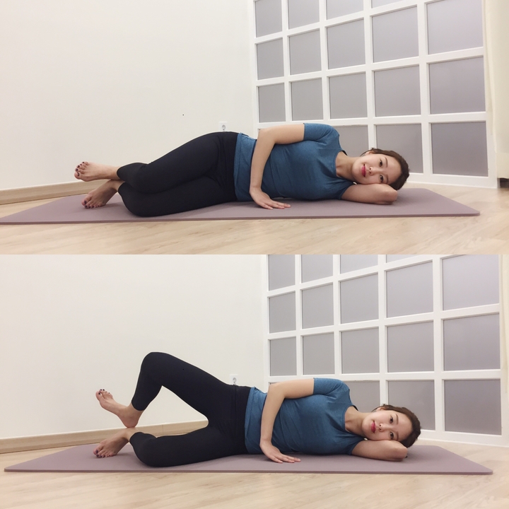 마지막으로 X자 다리가 고민이라면 옆으로 누워 무릎을 접고 어깨, 골반, 뒤꿈치를 일직선으로 만든다. 그 다음 뒤꿈치를 쪼이며 위쪽 다리를 오픈시켜 무릎이 천장 쪽으로 향하게 만든다. 이때 골반은 최대한 고정시켜준다.
