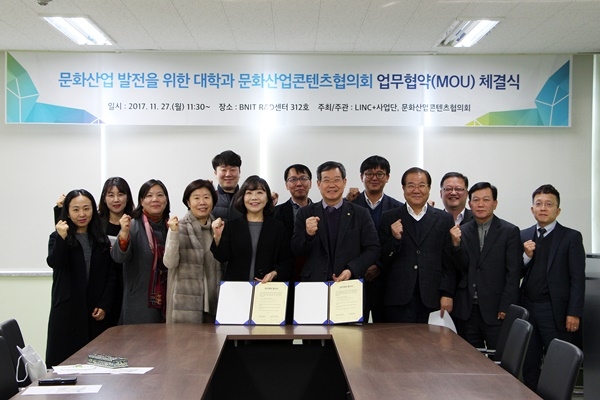국립 경상대학교 사회맞춤형 산학협력선도대학 육성사업단(LINC+사업단)이 27일 BNIT R&D센터에서 ‘지역문화발전을 위한 문화산업콘텐츠협의회’와 업무협약을 체결했다.