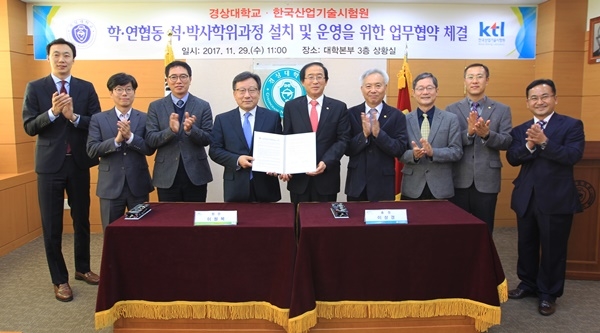 국립 경상대학교와 한국산업기술시험원(KTL)이 29일 대학본부에서 경상대학교 대학원에 학·연 협동연구 석·박사 학위과정을 운영하기 위한 업무협약을 체결했다.