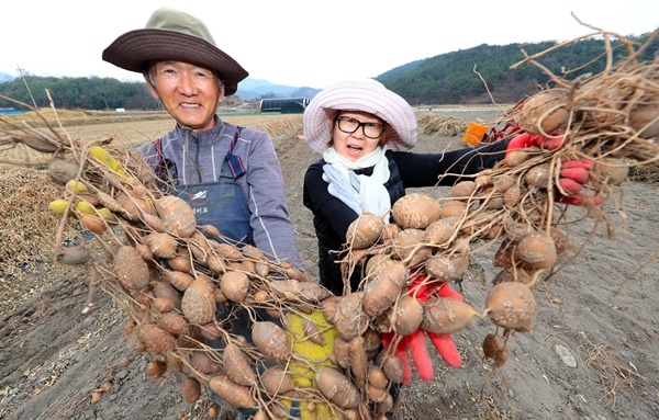 경남 산청군 신등면 가술리 거동마을 양재혁(62) 씨 부부가 병충해가 없고 크기가 커 슈퍼 아피오스로도 불리는 봉란(鳳鸞) 아피오스를 수확하고 있다.