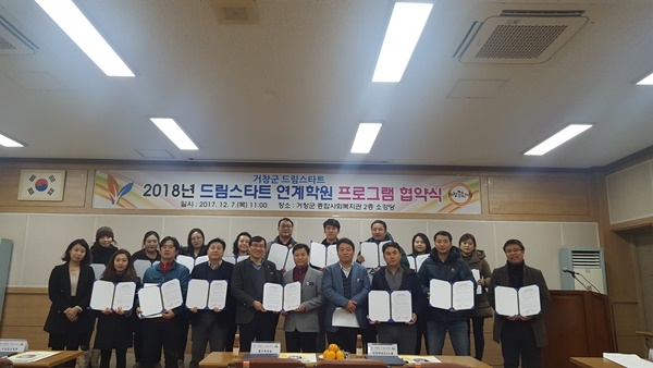 거창군 드림스타트가 7일 거창군종합사회복지관에서 관내 26개 학원대표가 참석한 가운데 학원연계 프로그램 추진을 위한 업무협약식을 열었다.