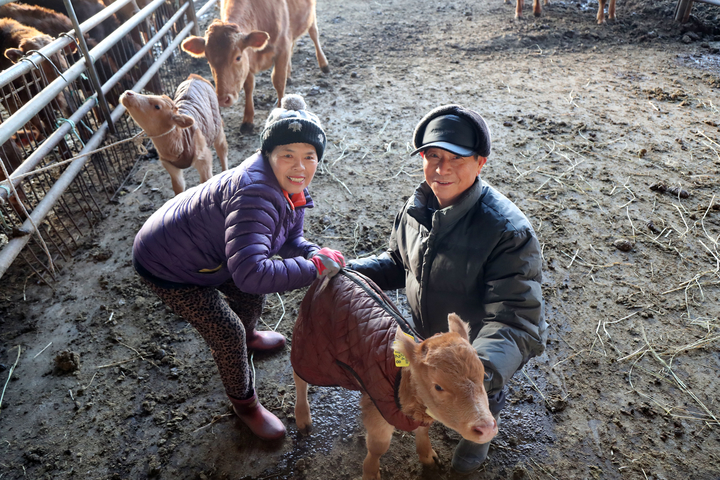 영하 10도 아래로 올 겨울 들어 가장 추운 날씨를 보인 지난 12, 경남 함양군 수동면 미동 한우농장에서 문기철 씨 부부가 갓 태어난 송아지에게 방한복을 입히고 있다.