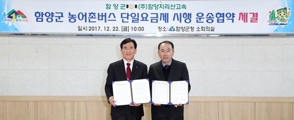 함양군이 내년 1월 1일부터 운행되는 농어촌버스 단일요금제 시행을 위해 22일 지역 운수업체인 ㈜함양지리산고속과 업무협약을 체결했다.