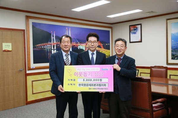 한국항공제조분과협의회가 지난 28일 사천시청 시장실을 방문해 소외되고 어려운 이웃들을 위해 써 달라며 성금 500만 원을 기탁했다.
