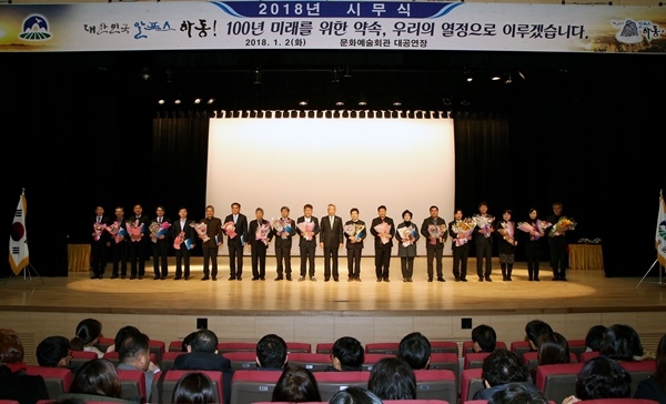 하동군은 2일 하동군문화예술회관 대공연장에서 윤상기 군수를 비롯한 400여 공무원이 참석한 가운데 2018년 시무식을 열었다.