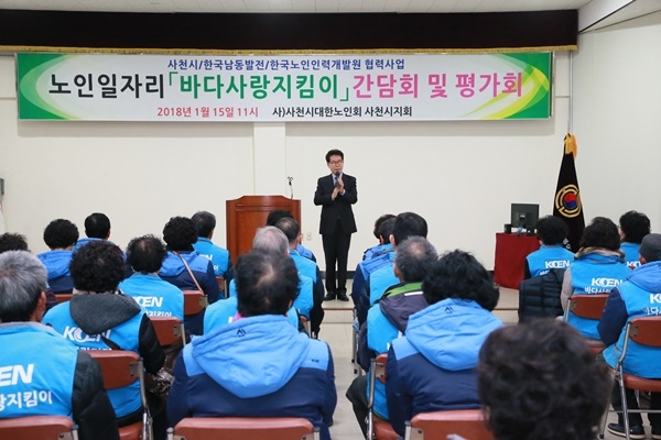 사천시는 15일 대한노인회사천시지회에서 한국남동발전, 한국노인인력개발원 관계자를 비롯한 바다사랑지킴이단 50여명이 참석한 가운데 ’바다사랑지킴이단‘ 간담회와 평가회를 열었다.