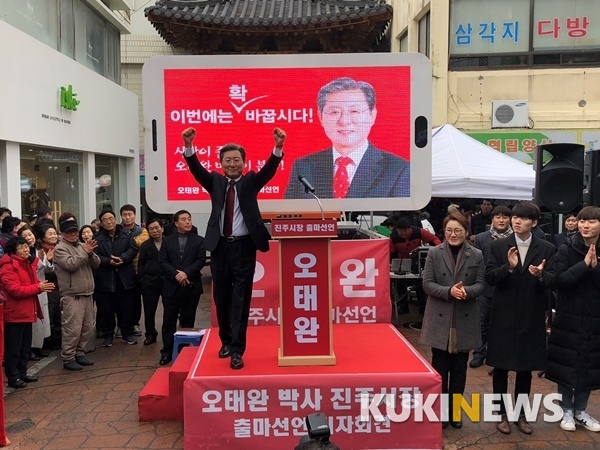 오태완(52) 진주정책연구원장이 17일 진주 중앙시장 입구에서 오는 6월 13일 진주시장 선거 출마 선언식을 열었다.