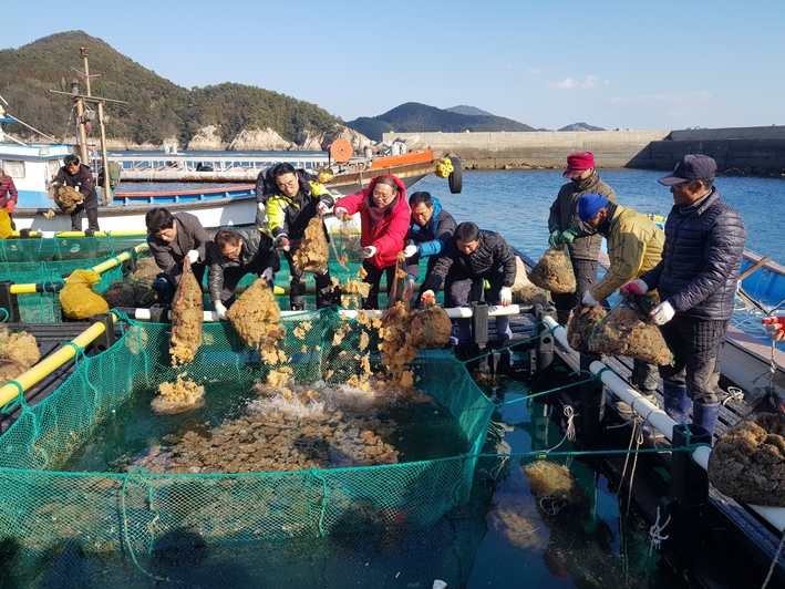 이에 따라 남해군은 국립수산과학원남동해수산연구소 남해양식연구센터, 남해군수협, 연안통발자율관리공동체와 합동으로 지난 29일 상주면 해상 가두리 시설에서 물메기 수정란 수용 행사를 열었다,