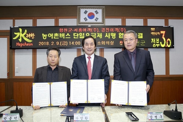 이를 위해 지난 9일 합천군은 하창환 합천군수, 박종덕 서흥여객(주) 대표, 강병구 경전여객(주) 대표 등 10여 명이 참석한 가운데 농어촌버스 단일요금제 협약식을 열었다.